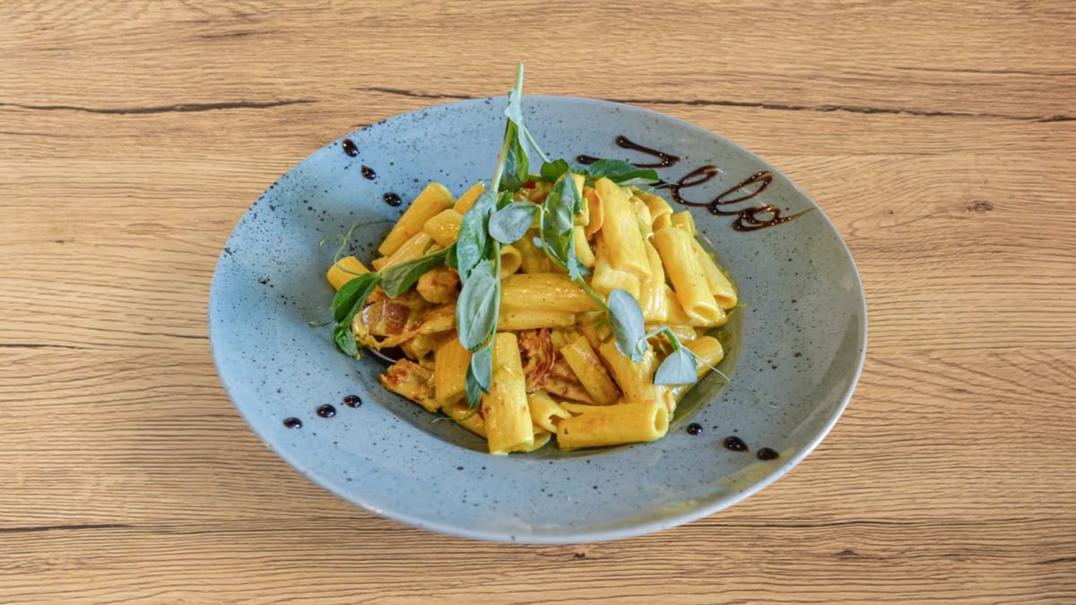 Pasta med kylling, bacon, grøntsager og karrysauce. Serveres med brød og smør