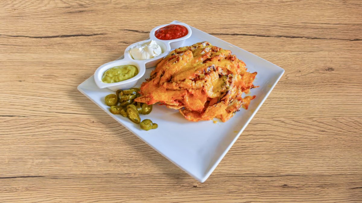 Varme og sprøde tortillachips med kylling, jalapeños og gratineret med cheddar. Serveres med salsa, guacamole og creme fraiche.