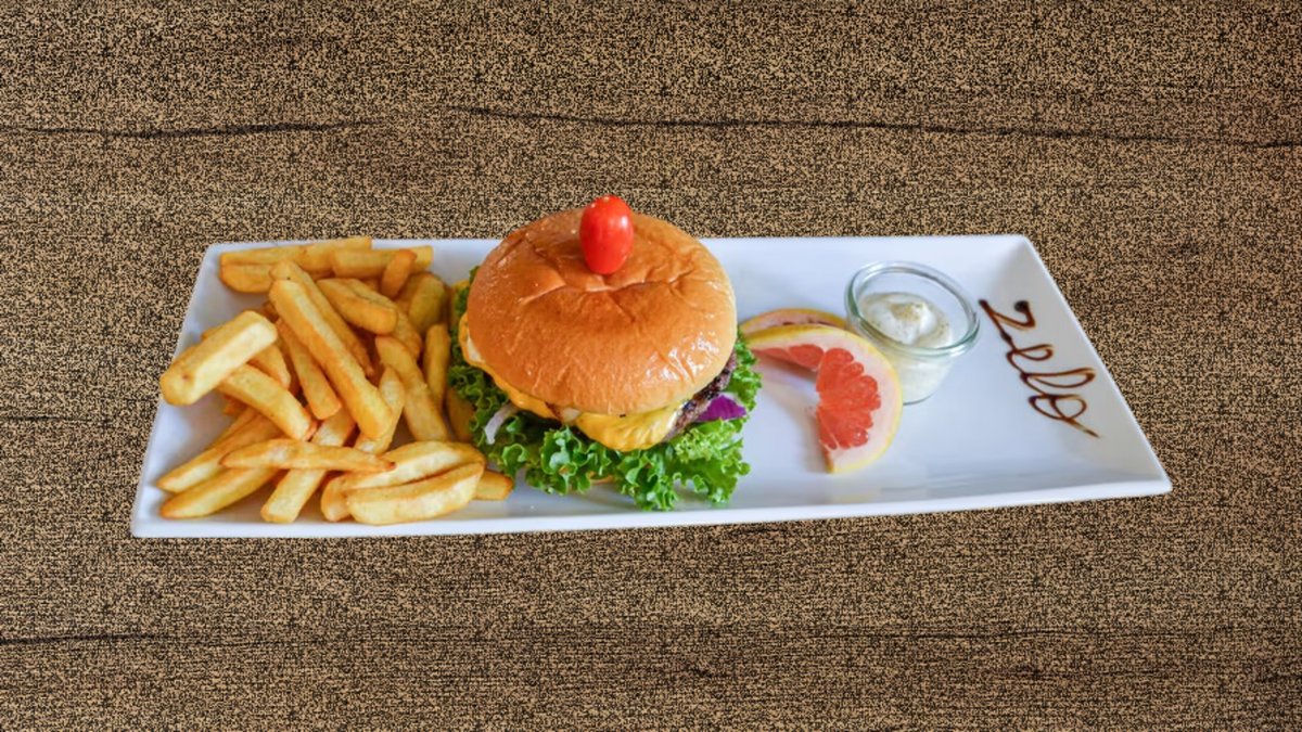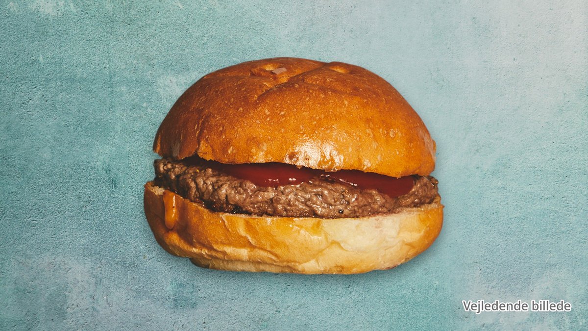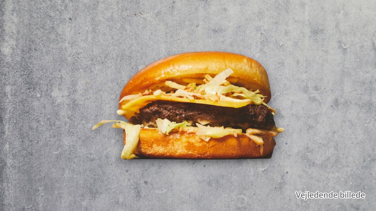 Hakkebøf, cheddar, bacon, ketchup, salat, tomat, rødløg og syltede agurker. Serveres med pommes frites og kryddermayo.