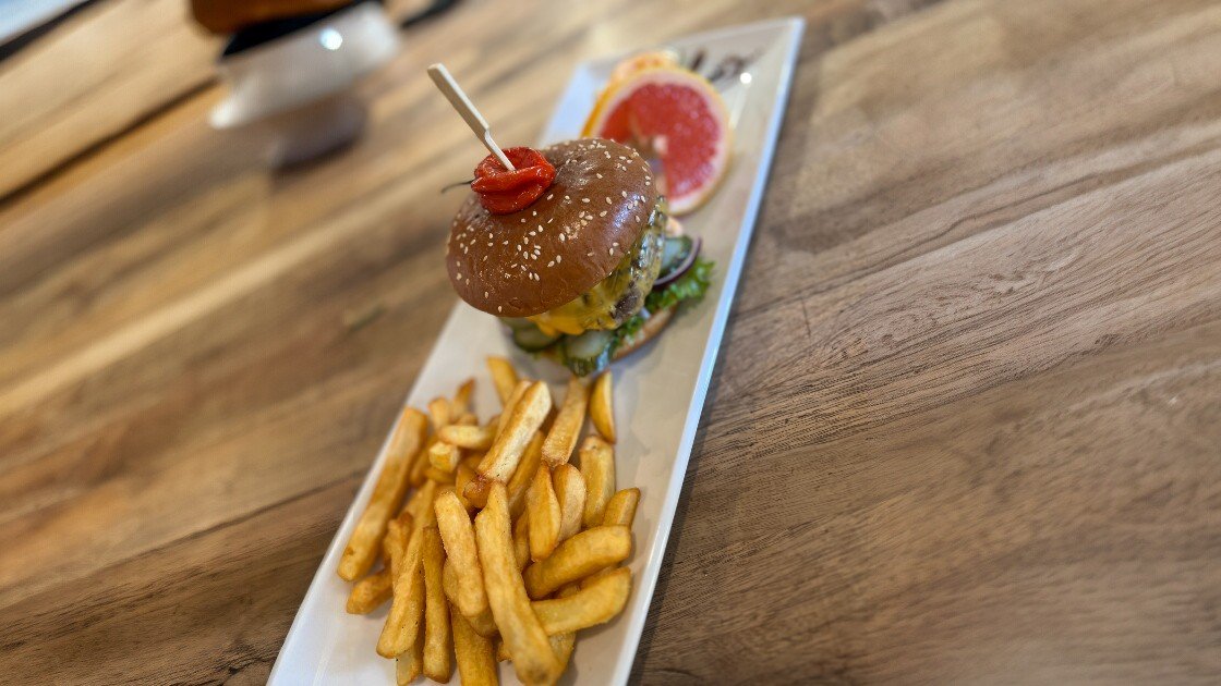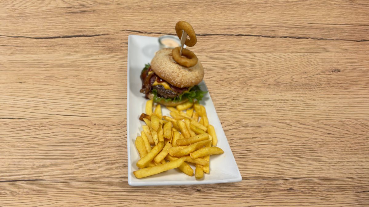Hakkebøf, salat, tomat, rødløg, syltede agurker, cheddar, bacon, sprøde løgringe og BBQ-sauce. Serveres med pommes frites og kryddermayo.