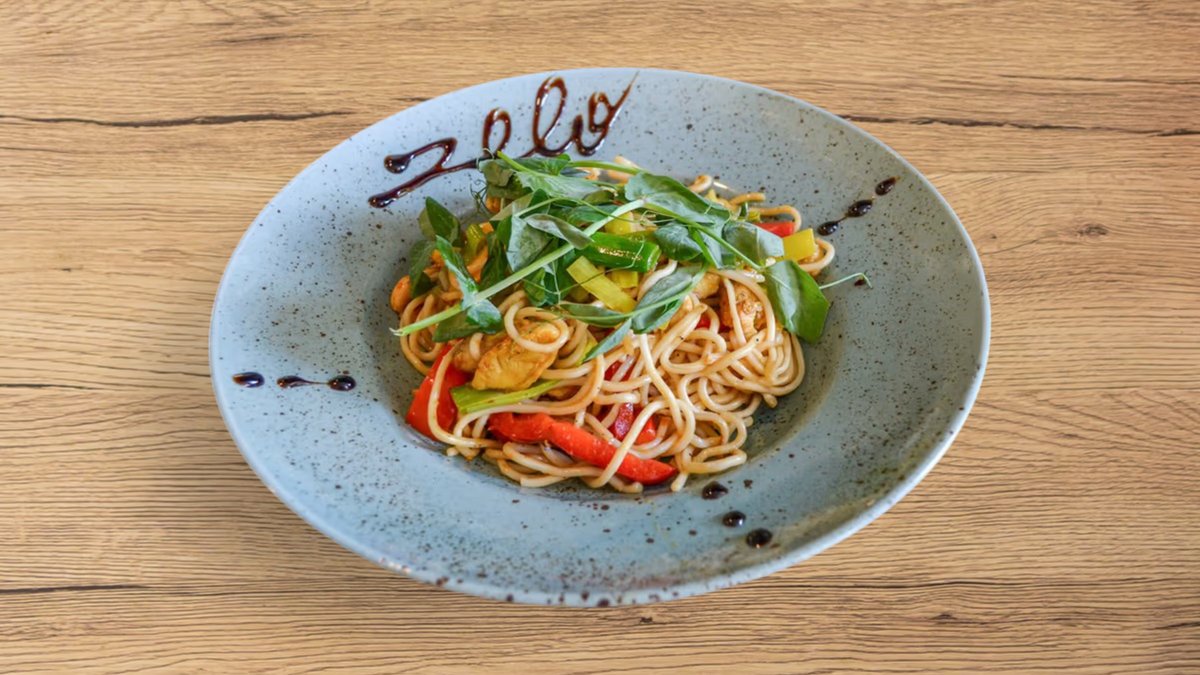 Ægnudler, snittede friske grøntsager, kylling og cashewnødder vendt i woksauce.