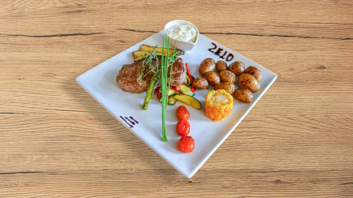 Oksefilet af 250 gr. serveres med smørstegte kartofler, grøntsager og bearnaise- eller pebersauce.