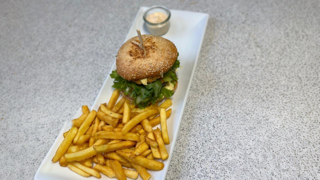 Paneret kylling, salat, tomat, rødløg, syltede agurker og karrydressing. Serveres med pommes frites og kryddermayo.