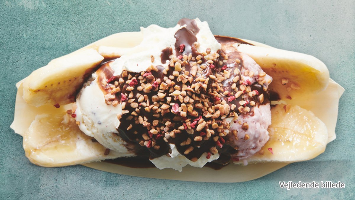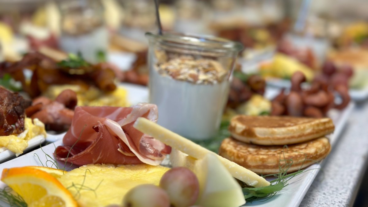 Yoghurt med mysli og honning Røræg, bacon, brunchpølser, ost og druer Serrano-skinke med melon Pandekager med ahornsirup Brød og smør. Serveres med juice.