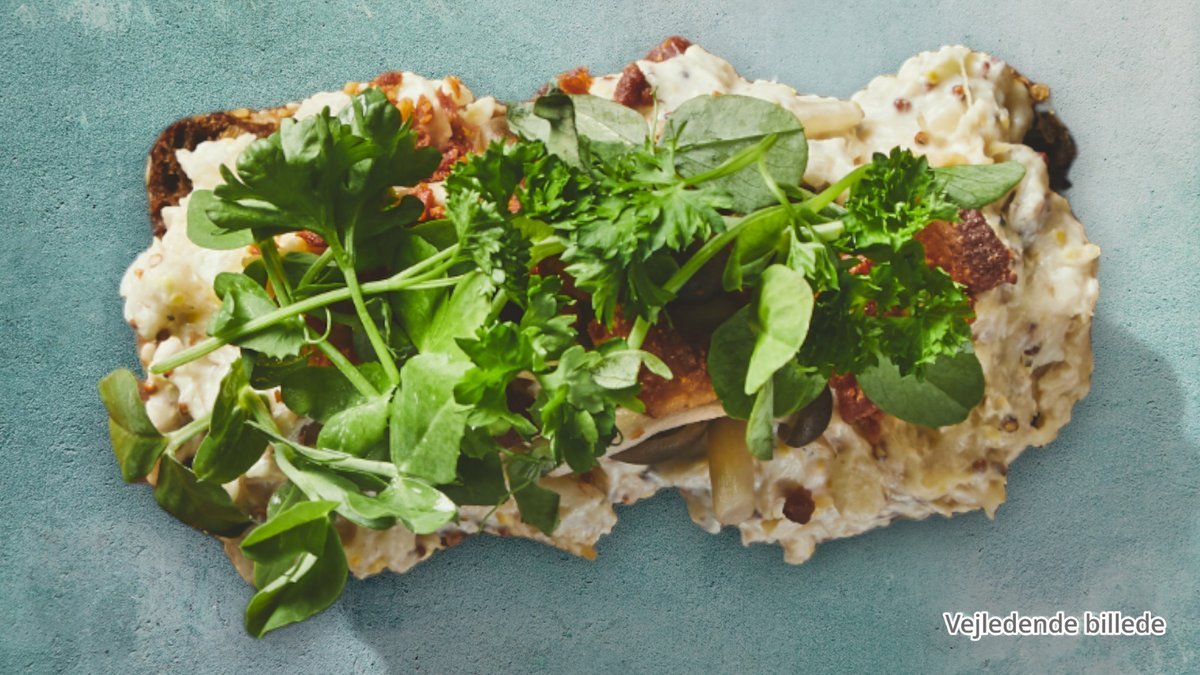 Ristet rugbrød, hønsesalat, sprødstegt bacon og friske urter.