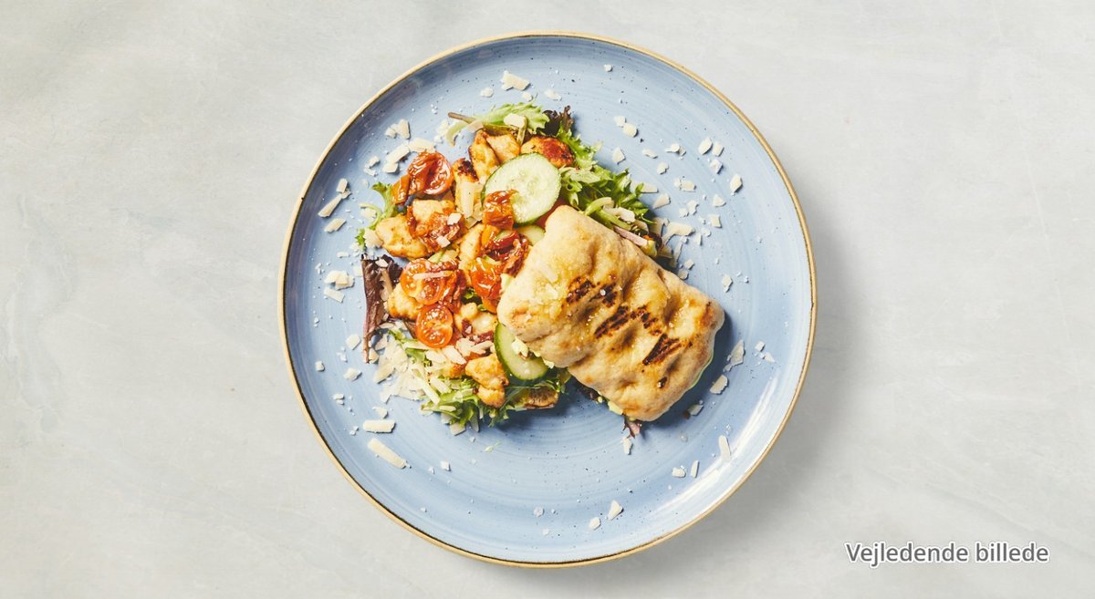 Krydret kylling vendt i mexicansk sauce og indbagt i tortillabrød gratineret med cheddar. Anrettet med blandet grønt, salsa, guacamole, creme fraiche og fritter.