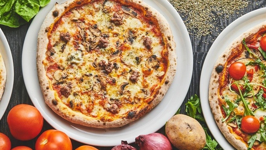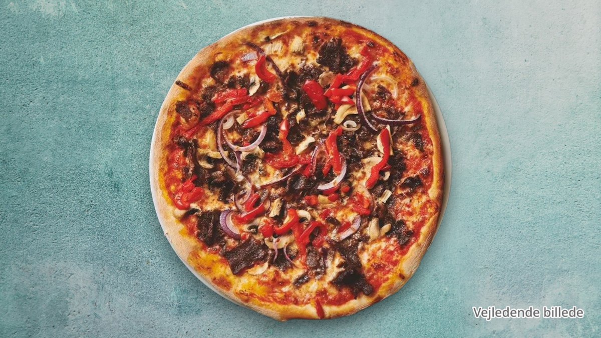 Tomat, ost, oksefars, gorgonzola, bacon, champignon og løg.