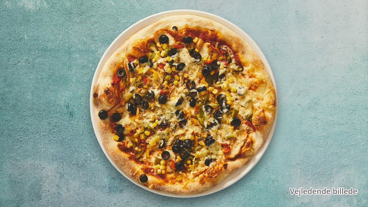 Tomat, ost, ananas, paprika, champignon, løg, oliven og hvidløg.