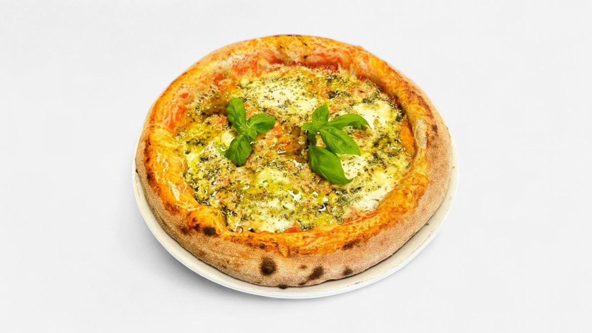 Med tomatsauce, mozzarella ost, ekstra ost, pesto, oregano og basilikum.