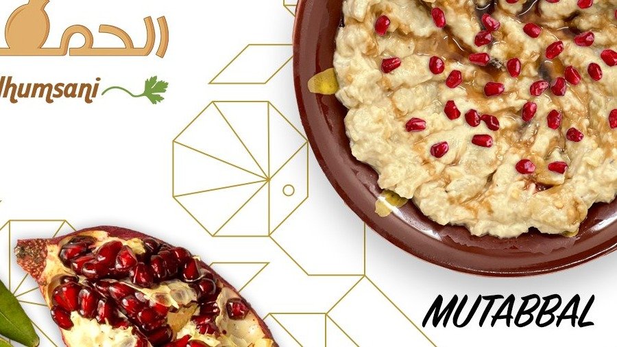 Grillet aubergine rørt med citron, hvidløg og olivenolie, toppet med peberfrugt, granatæble og persille.