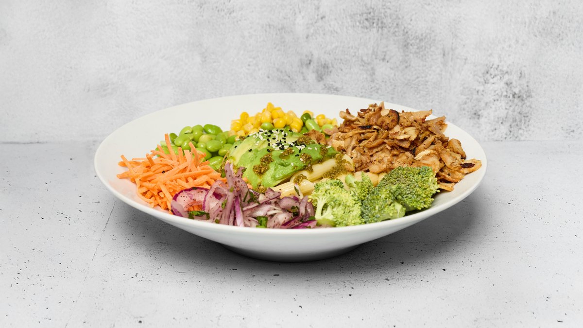 Kylling, pasta pesto, broccoli, majs, ærter, gulerødder, avocado, marinerede rødløg, edamame og valgfri dressing.
