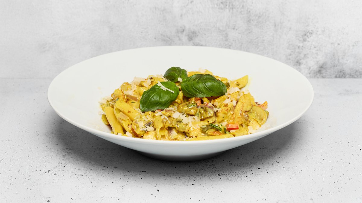 Pasta penne, champignon, peberfrugt, rødløg, karry, flødesauce & parmesan. Serveres med brød.