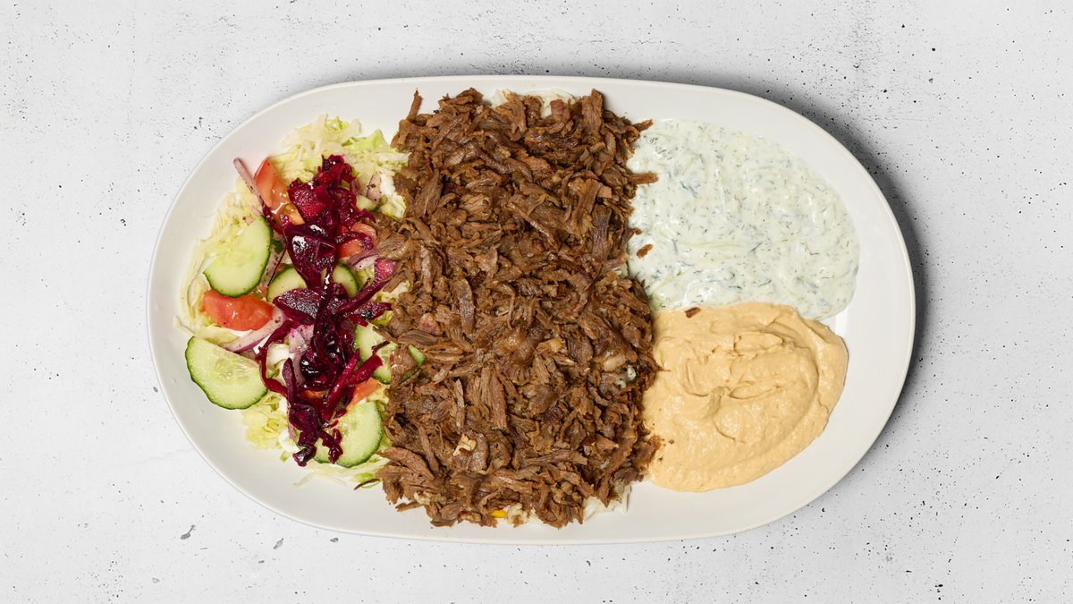 Ris, hummus, tzatziki, marinerede rødløg, citronmarineret rødkål, salat, tomat, agurk & crème fraîche dressing og valgfri protein.