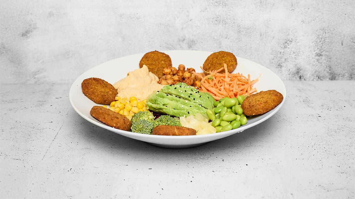 Falafel, kikærter, gulerødder, edamame, ananas, broccoli, majs, avocado, citronmarineret rødkål, hummus og valgfri dressing.