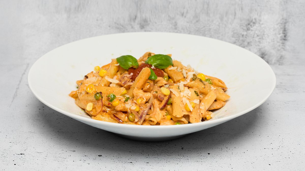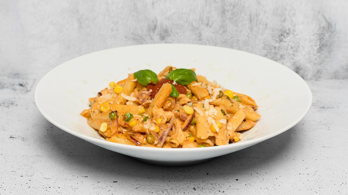 Pasta penne, ærter, rødløg, hvidløg, chilisauce, majs, flødesauce & parmesan. Serveres med brød.