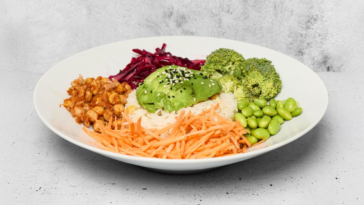Ris, kikærter, gulerødder, edamame bønner, avocado, broccoli, citron marinerede rødkål & crème fraîche dressing.