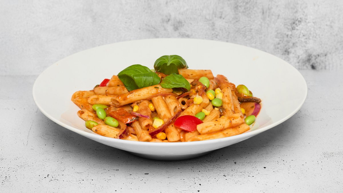 Pasta Penne, champignon, peberfrugt, rødløg, edamame bønner, majs, tomatsauce, flødesauce & parmesan. Serveres med brød.