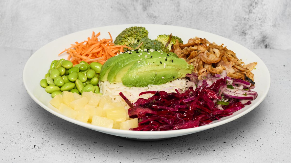 Ris, kylling, broccoli, gulerødder, ananas, avocado, edamame, citronmarineret rødkål, marinerede rødløg og valgfri dressing.