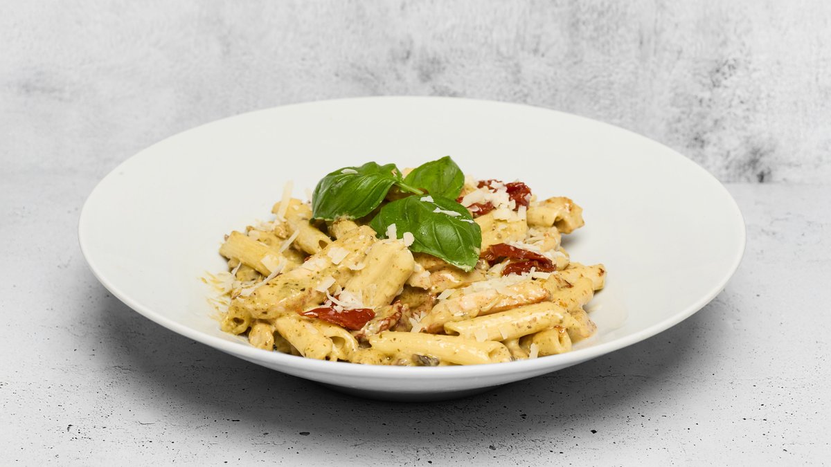 Penne, soltørrede cherrytomater, pesto, kylling, champignoner, feta, flødesauce og parmesan. Serveres med brød og smør.