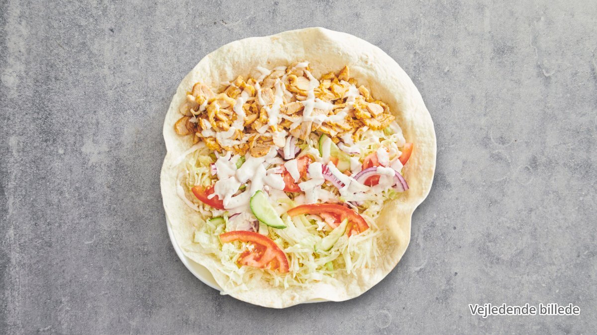 Durum med fyld af kylling, hjemmelavet hvidløgsdressing, tomater, syltede agurker, icebergsalat og hjemmelavet dressing.