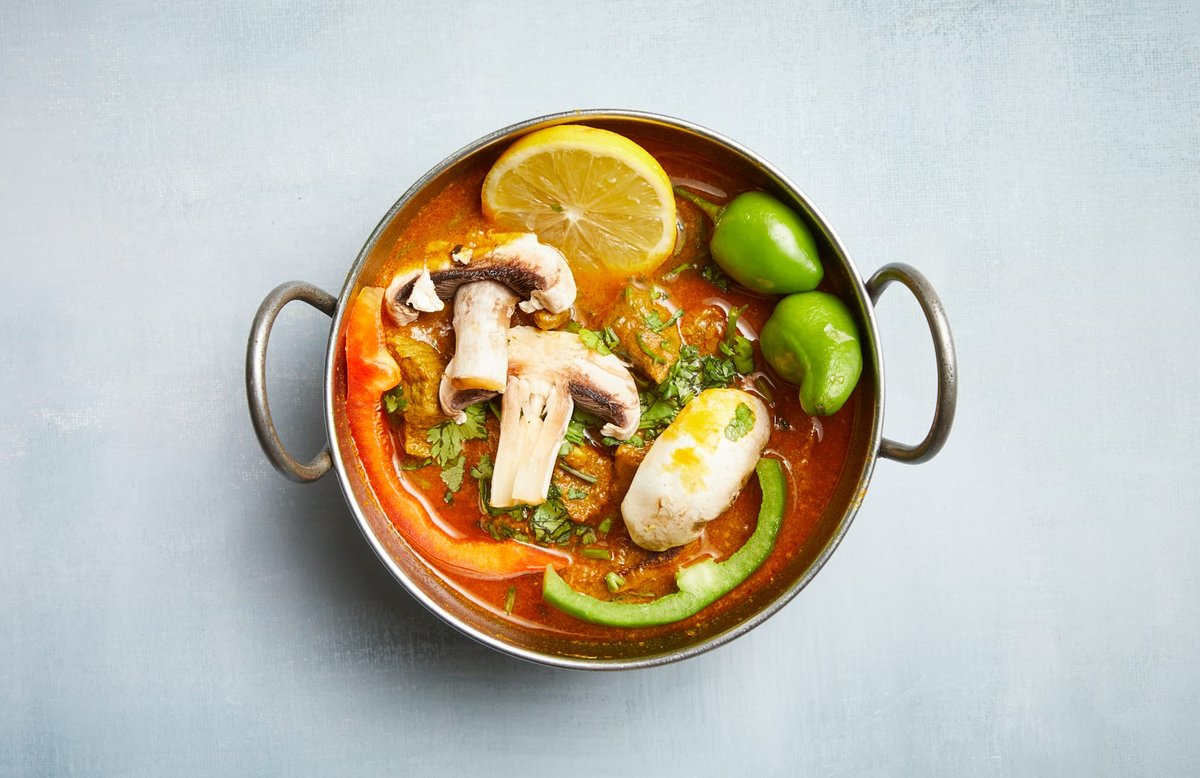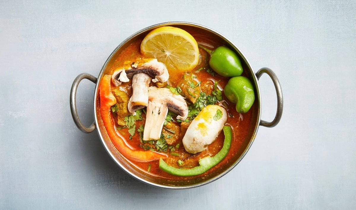 Traditionel karry med lam, friske champignoner og tomat. Serveres med ris.