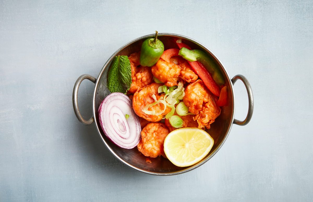 Marinerede kongerejer med biryani-masala og friske krydderurter. Serveres med ris.