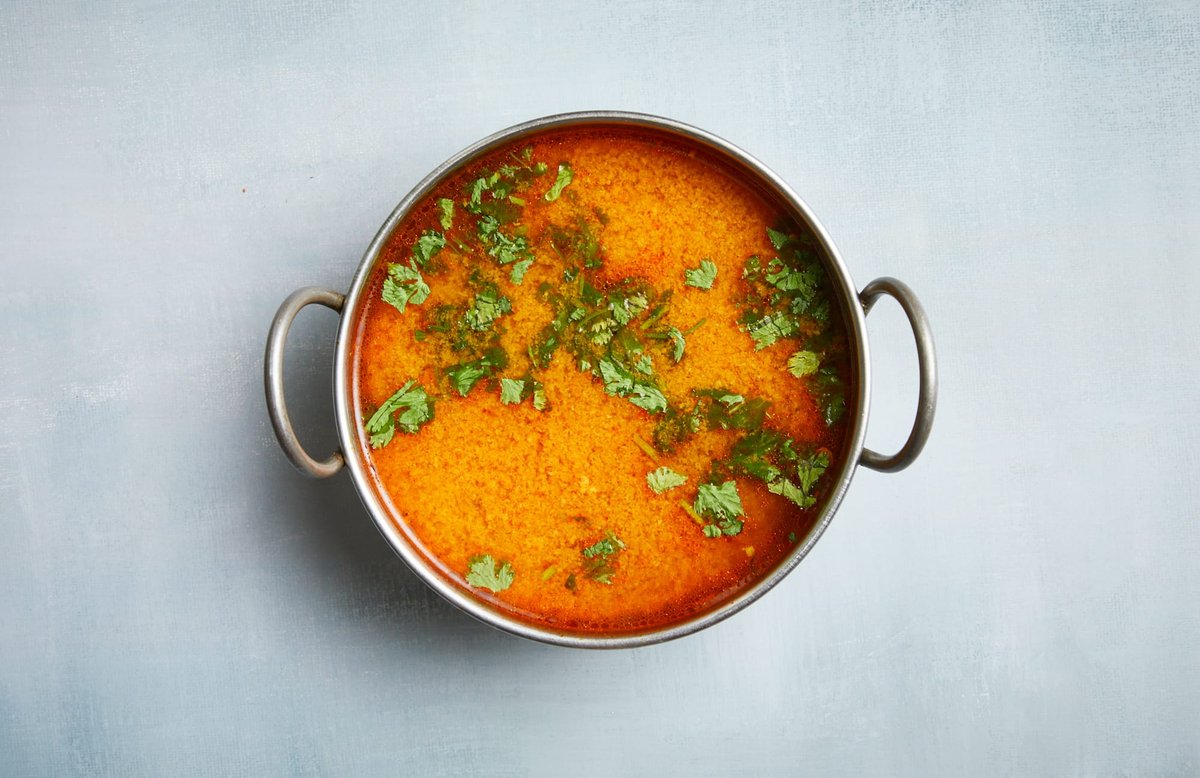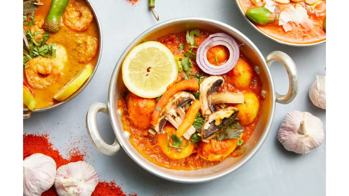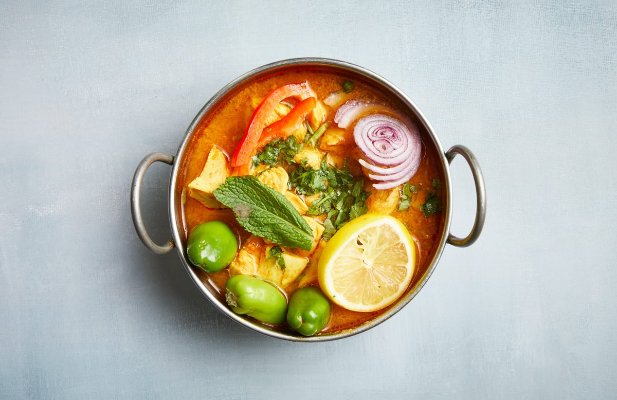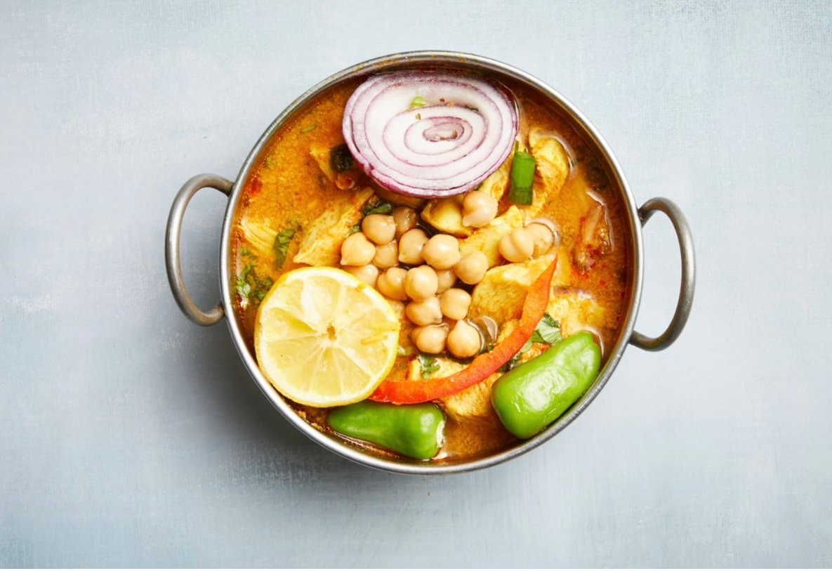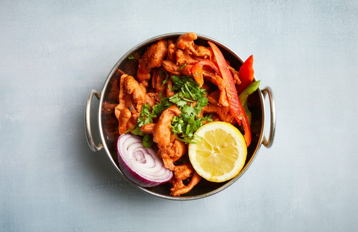 Kylling tilberedt i stærk sauce. Serveres med ris.