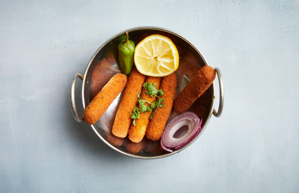 Friturestegt Paneer-ost tilberedt i kikærtedej.