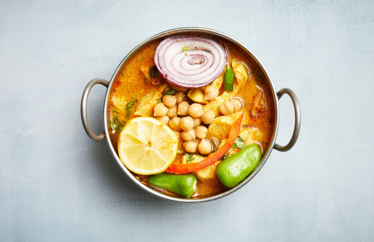 Cremet karry med kylling, kikærter. Serveres med ris.