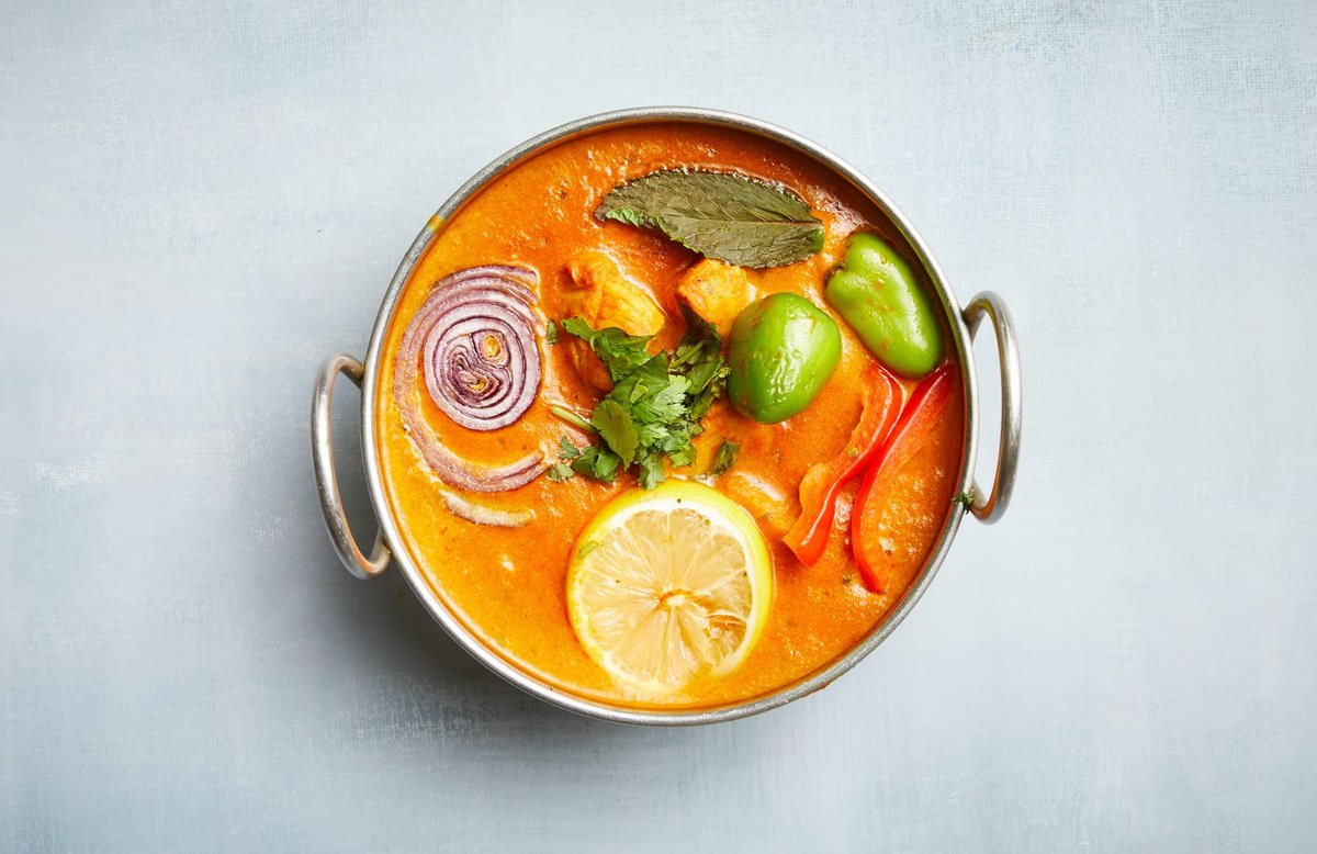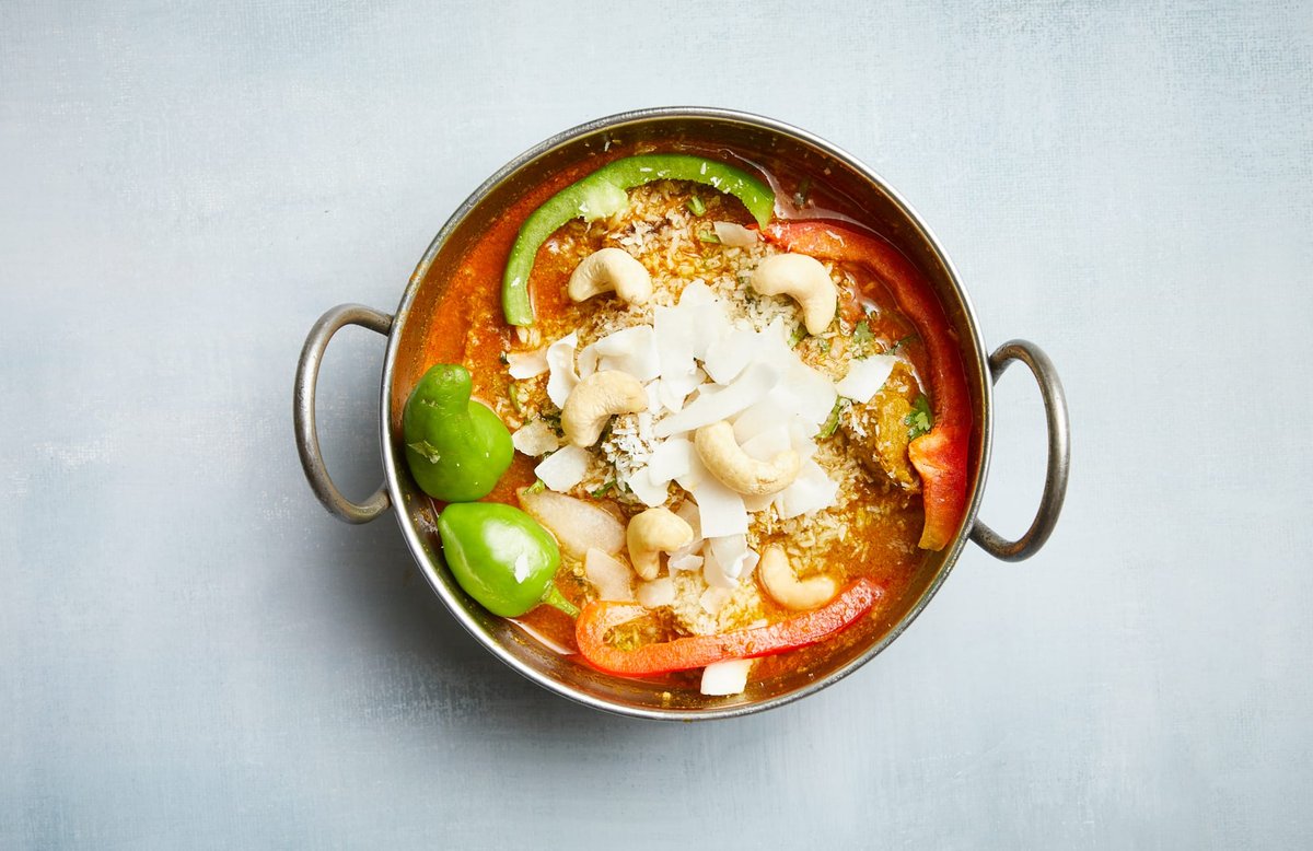 Mild karry, marineret kylling tilberedt i kokos og indiske krydderier. Serveres med ris.