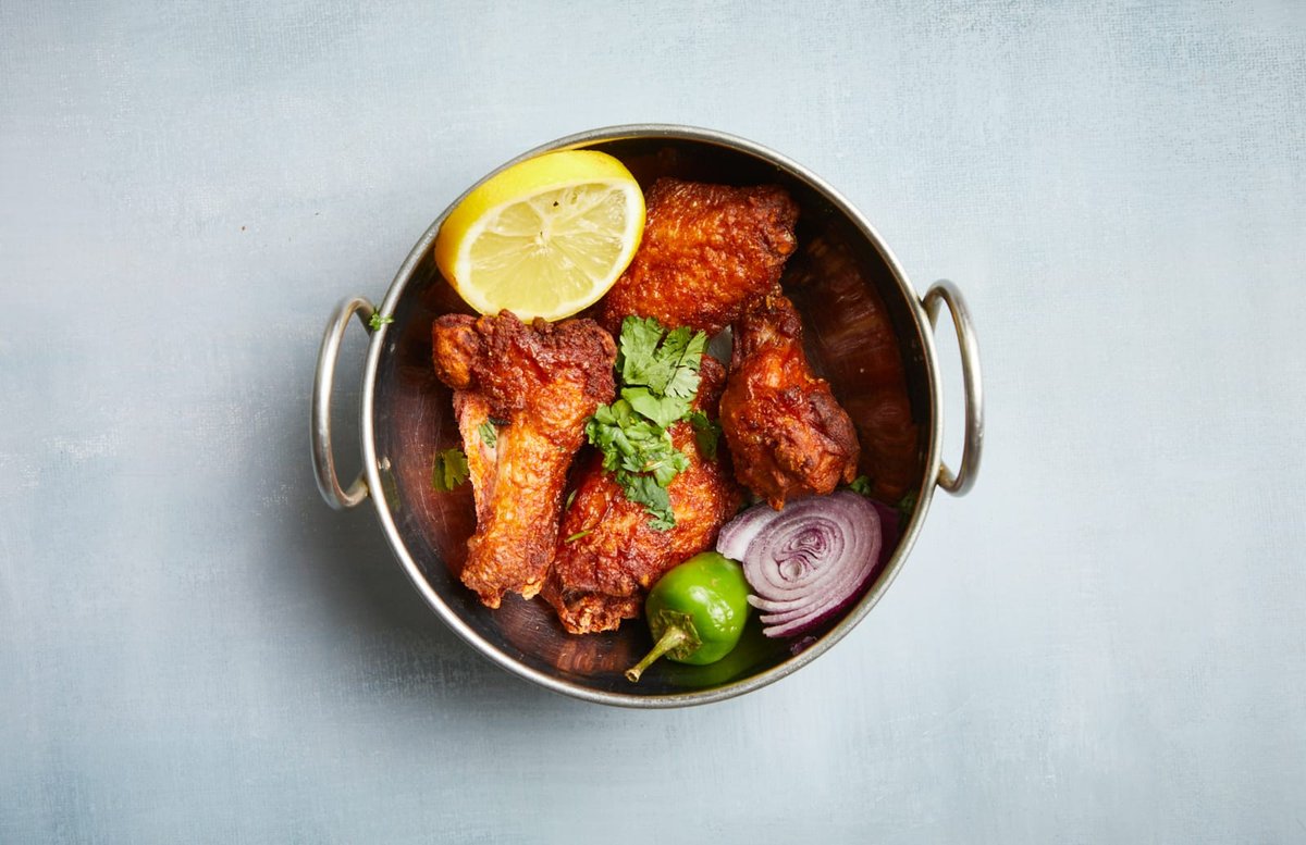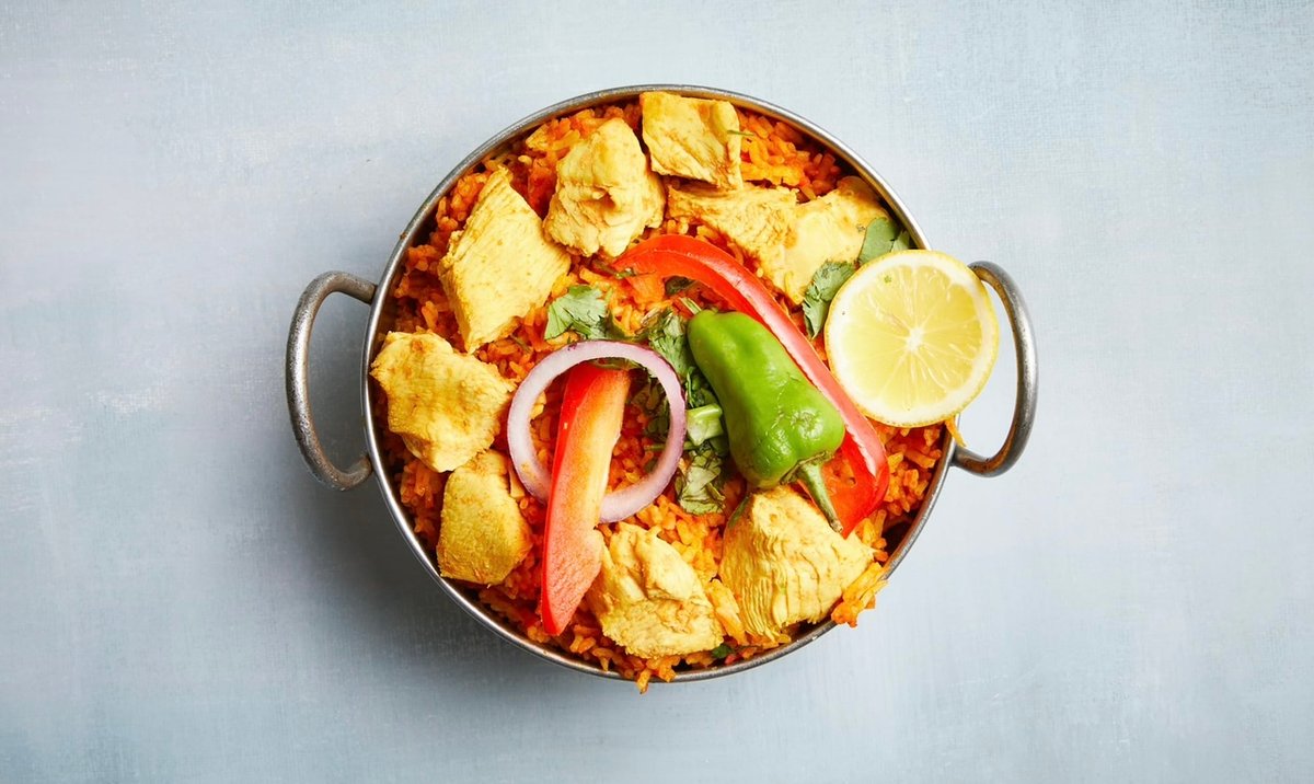 Marineret kylling med biryani-masala og friske krydderurter. Serveres med ris.
