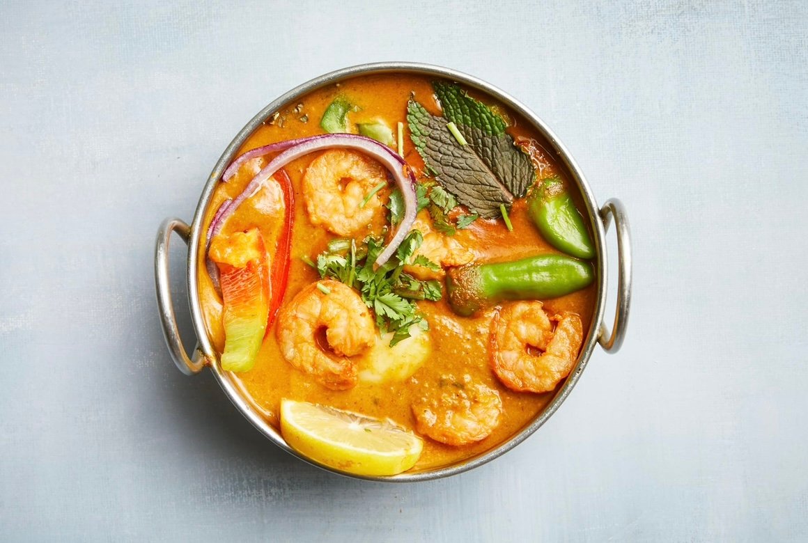 Mild karry, rejer tilberedt i kokos og indiske krydderier. Serveres med ris.