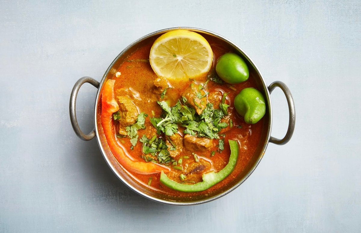 Lam tilberedt i stærk sauce. Serveres med ris.