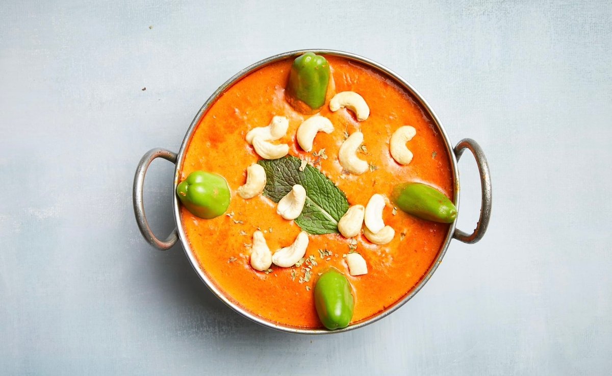 Marinerede tigerrejer tilberedt i fløde med hele cashewnødder. Serveres med ris.