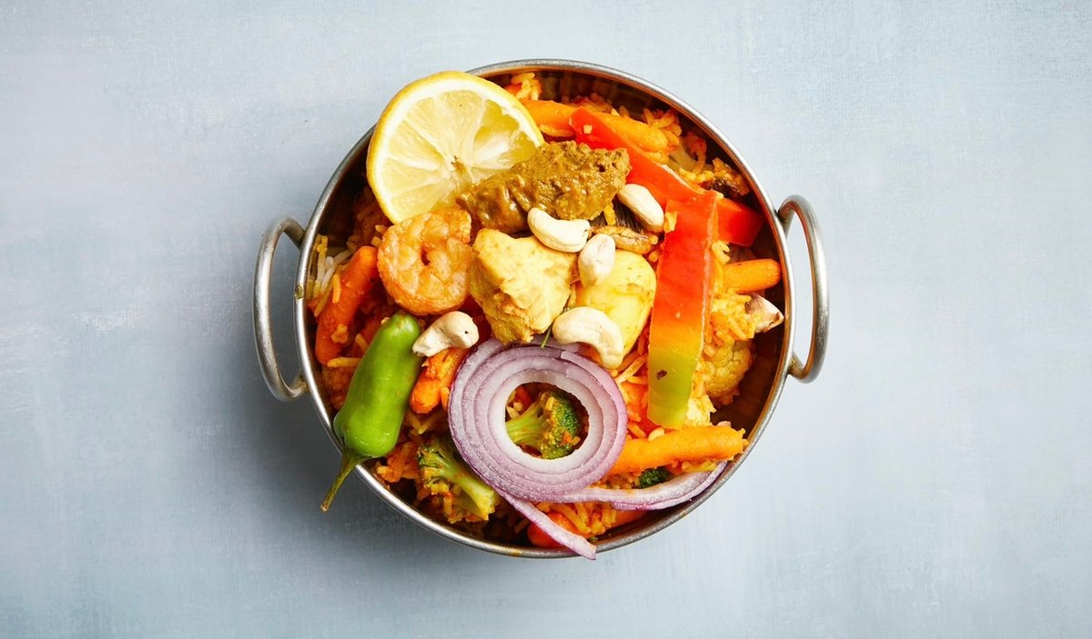 Marineret Beef, kylling og kongerejer med stegte kartofler, biryani-masala og friske krydderurter. Serveres med ris.