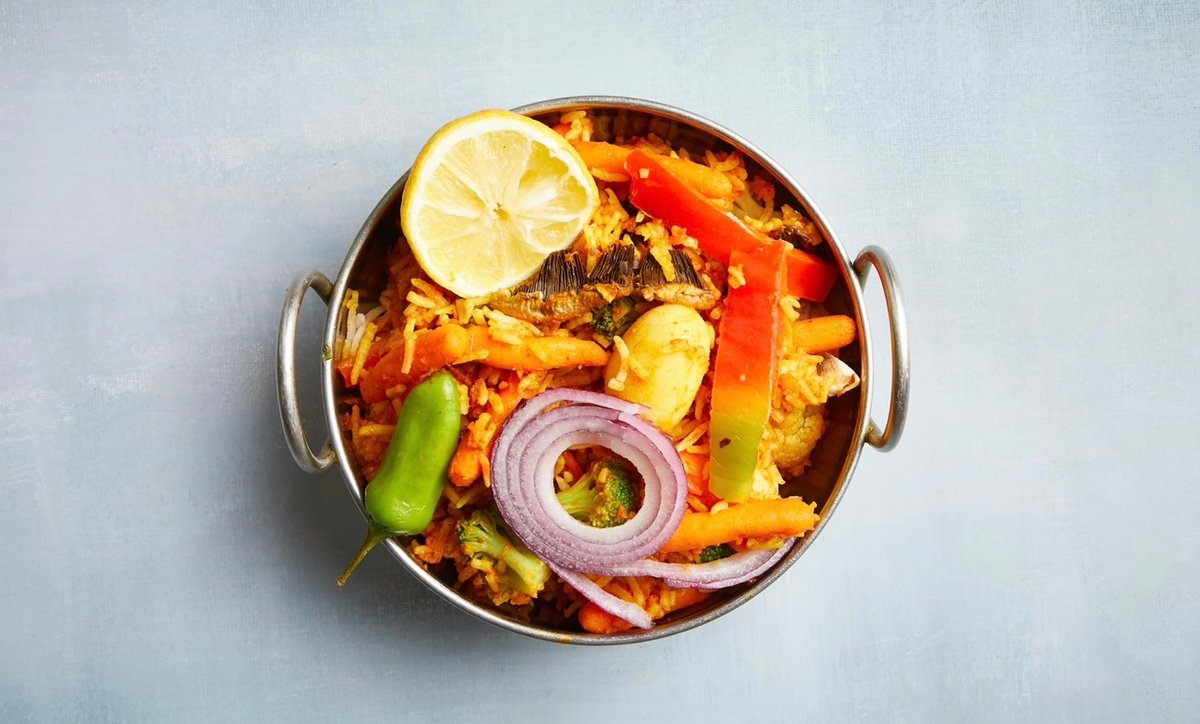 Grøntsager med biryani-masala og friske krydderurter. Serveres med ris.