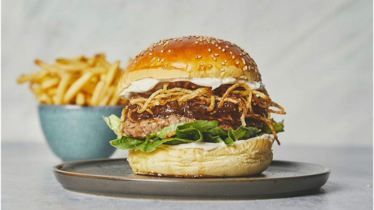 Briochebolle med fyld af dansk oksebøf, røget aioli, stegte løg, hjemmelavede ristede løg, monterey jack ost og syltede rødløg.