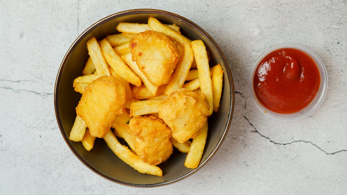 Serveret med pommes og ketchup.