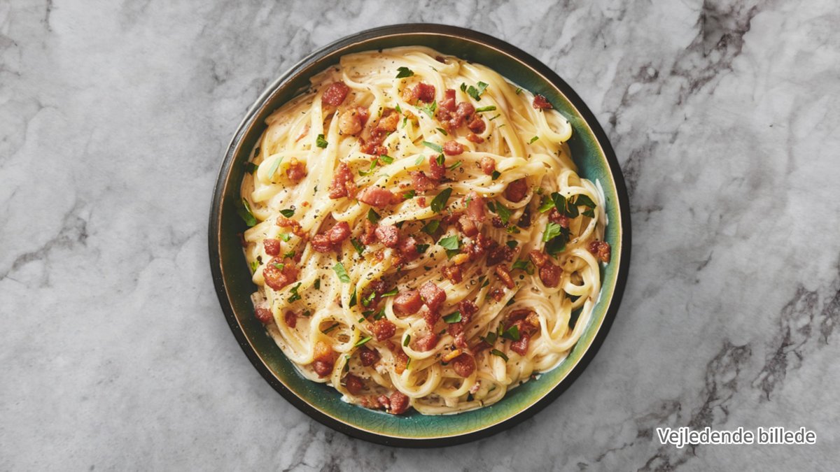 Pasta vendt i flødesauce med bacon, peber og æggeblomme. Toppes med revet ost.