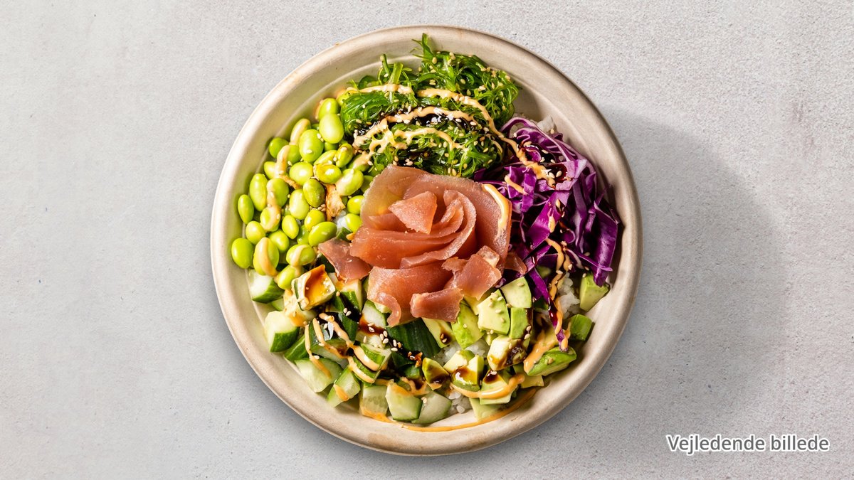 Tun, avocado, ananas, edamame, tangsalat, agurk og ris. Toppes med sesam og spicy sriracha sauce.