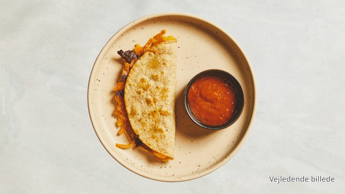 Tortilla med vegetarisk kylling, ost, peberfrugt, tomat og løg toppet med smeltet ost og krydret tomatsauce. Serveres med salsa, guacamole og creme fraiche.