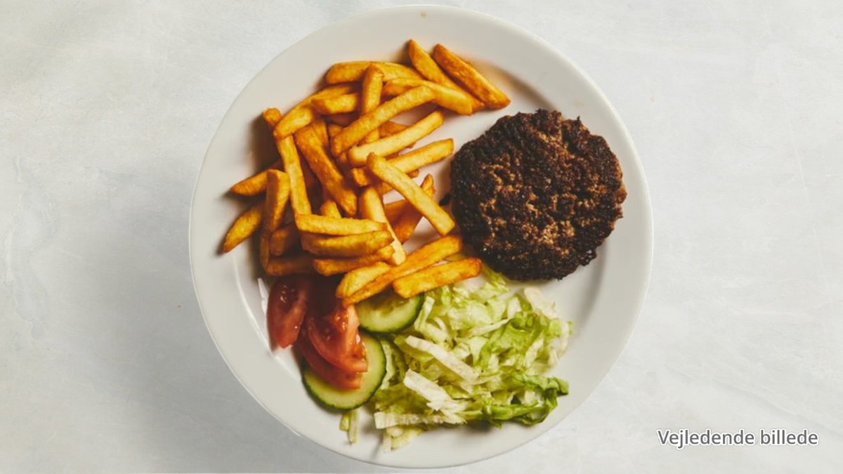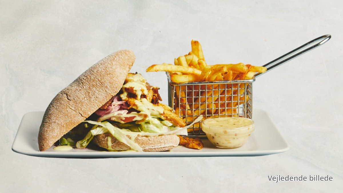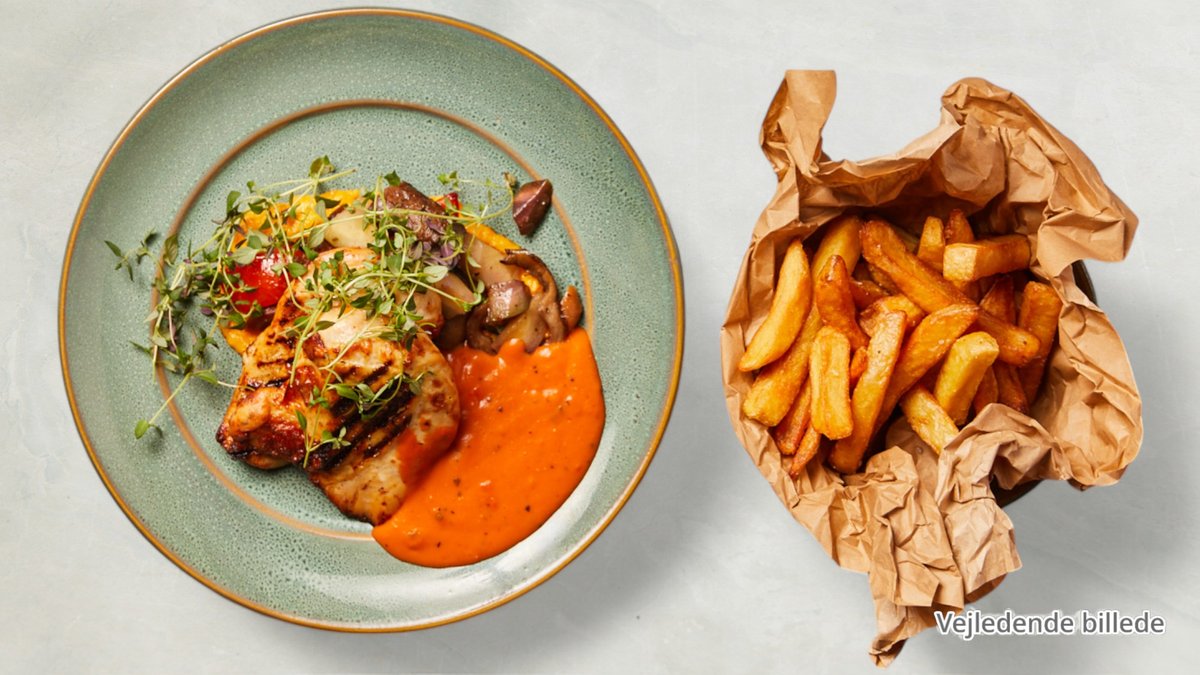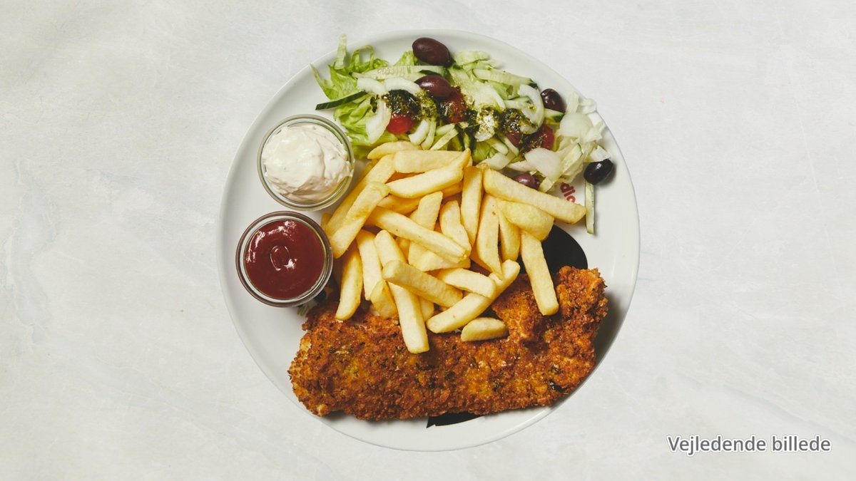 Serveret med pommes frites, blandet salat, ketchup og remoulade.