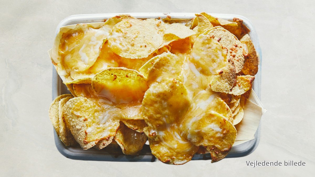 Sprøde tortillachips gratineret med cheddar serveret med salsa, creme fraiche, guacamole, oliven og jalapeños.