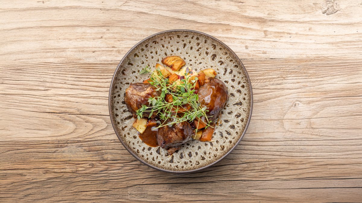 Klassisk mørbradgryde på en bund af hjemmelavet kartoffelmos.
