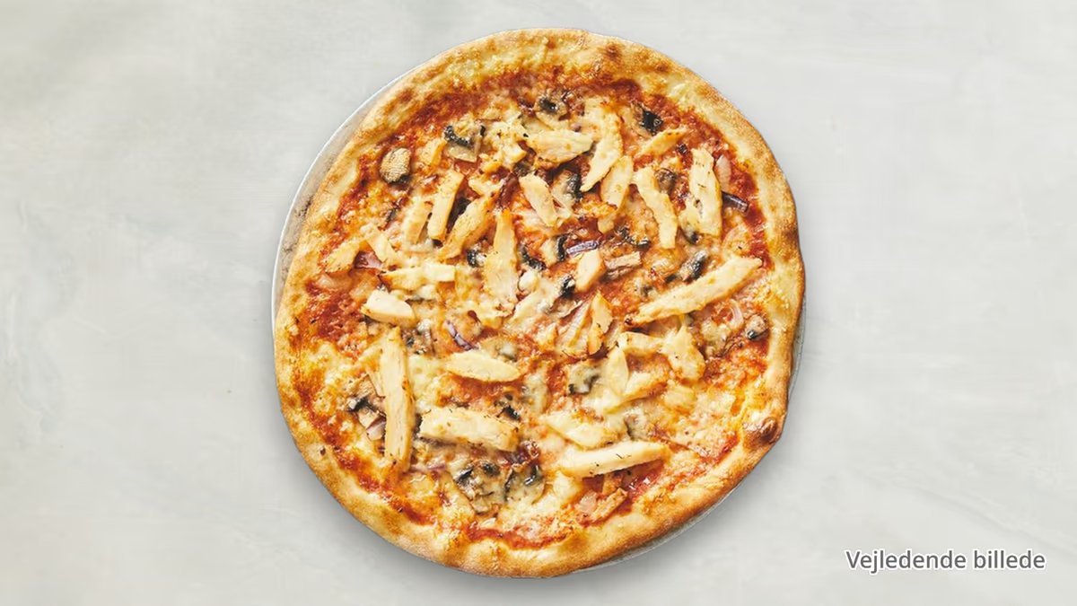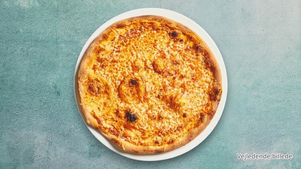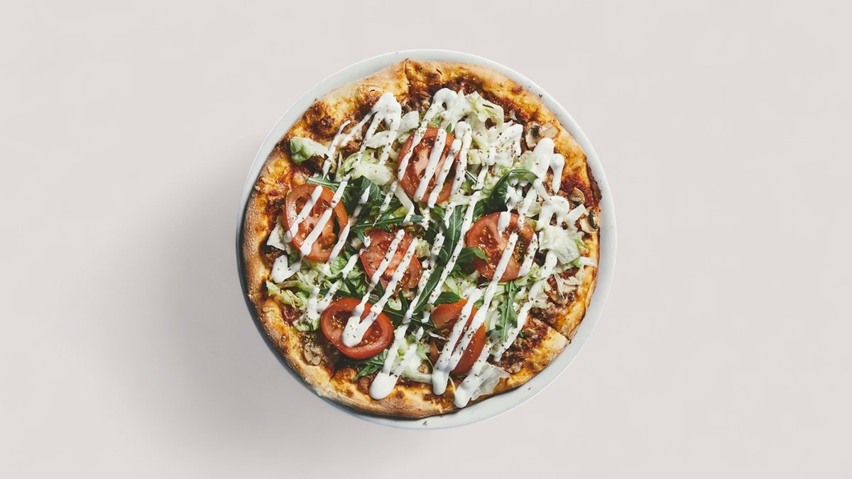Tomatsauce, ost, kebab, salat, tomatskive og dressing