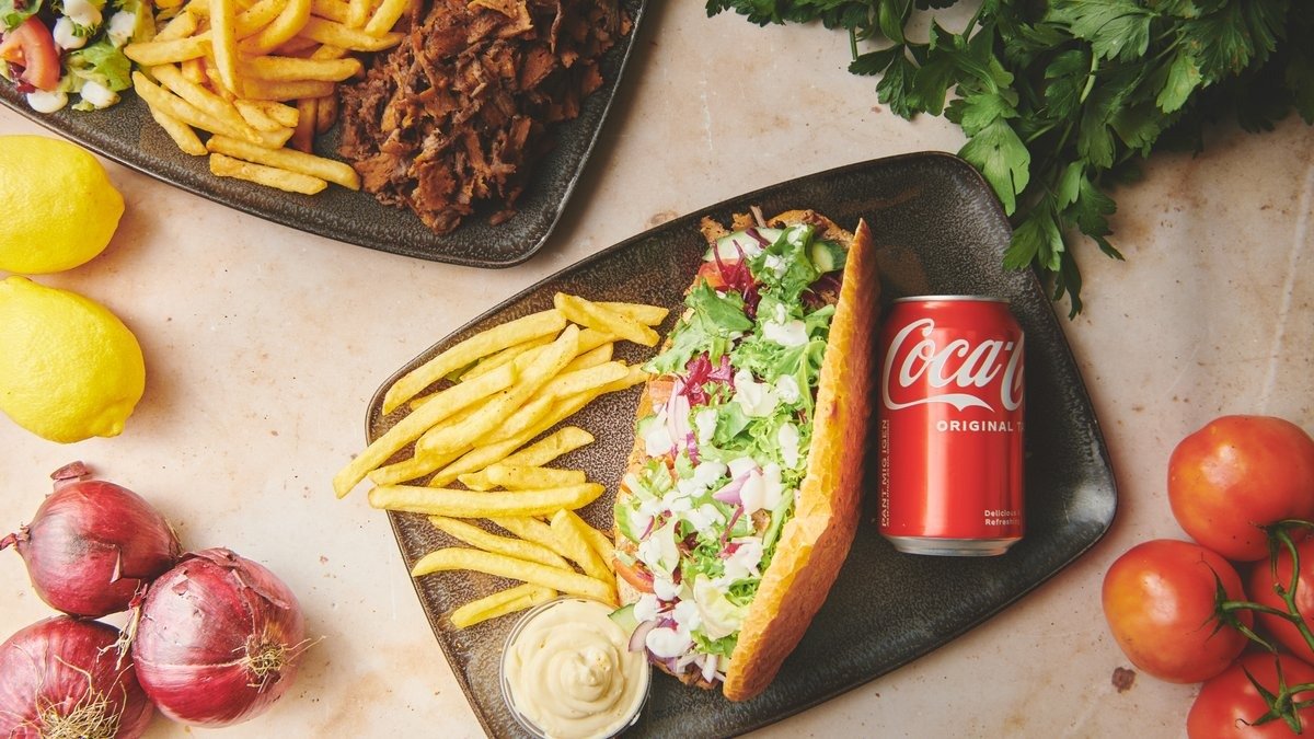 Döner med fyld af valgfri protein, valgfri dressing, salat, syltede rødkål, rødløg og sumak. Serveres med pommes frites og en valgfri drikkevare.