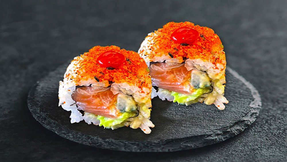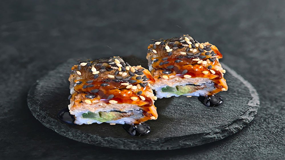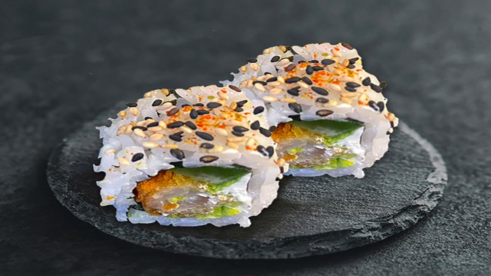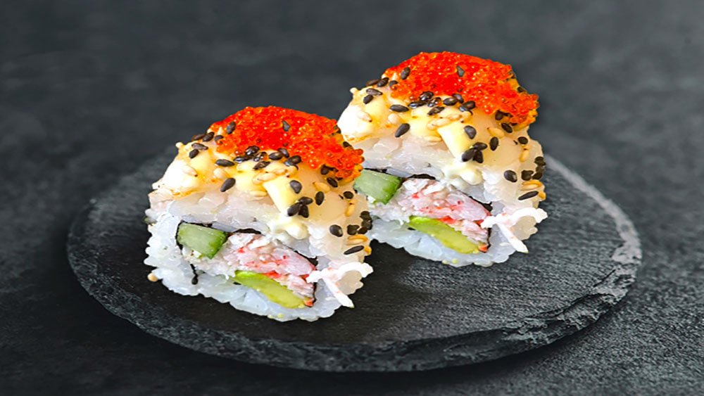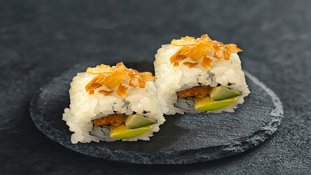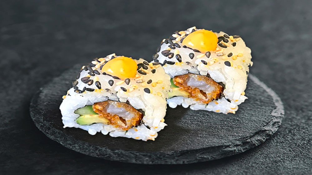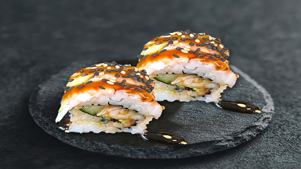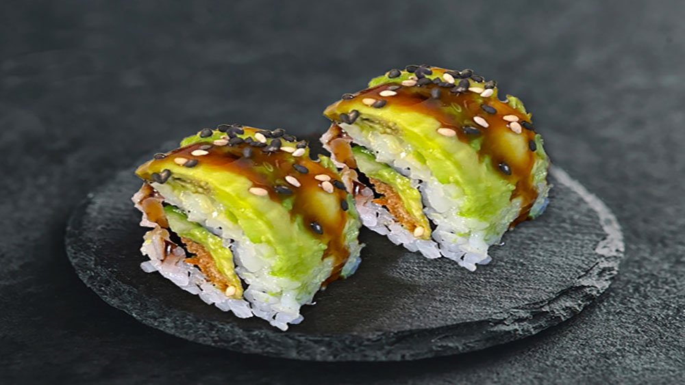 avocado agurk teriyaki sauce tempura kylling ,toppet med ebi rejer avocado teriyaki sauce sesam