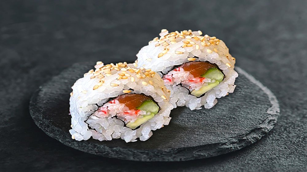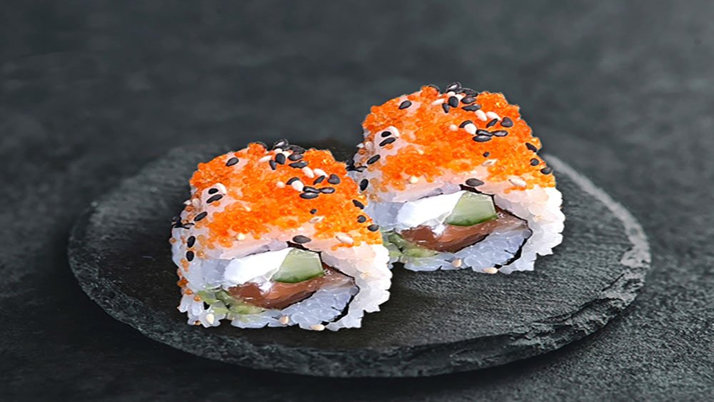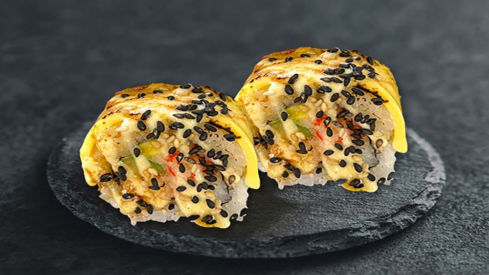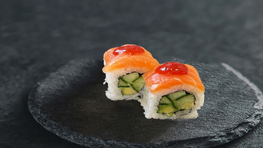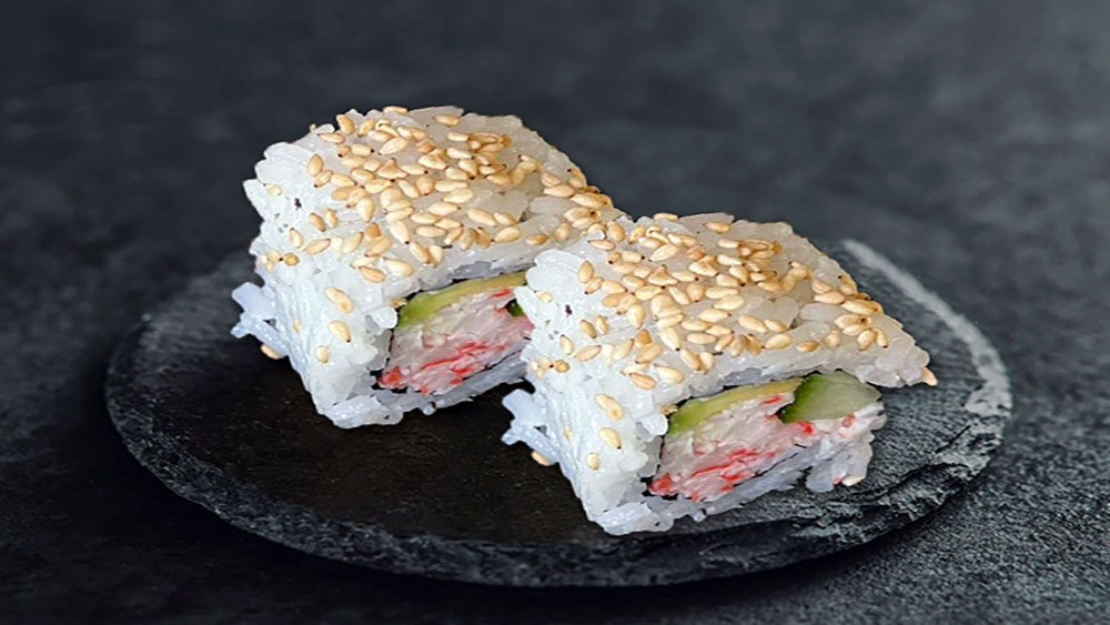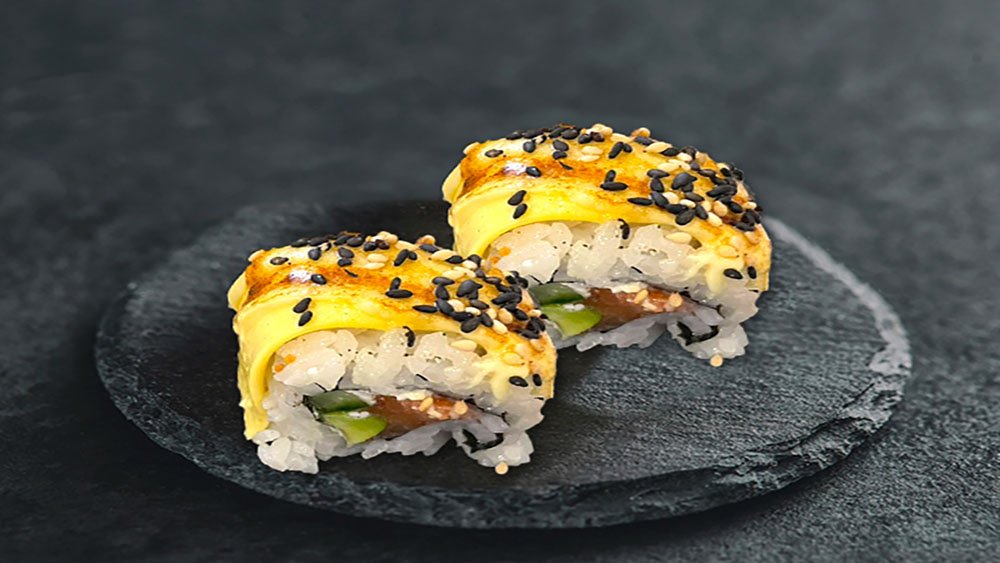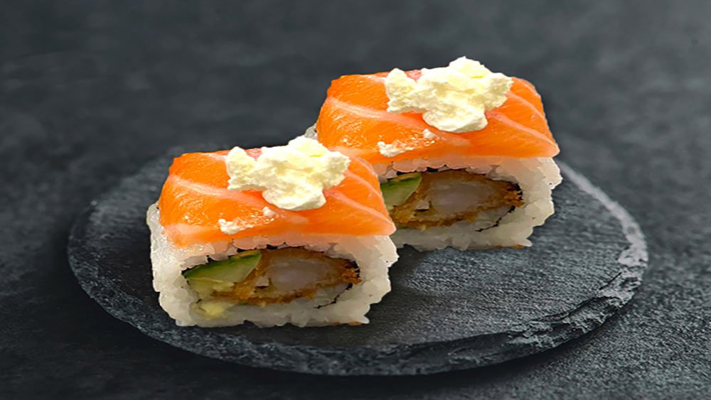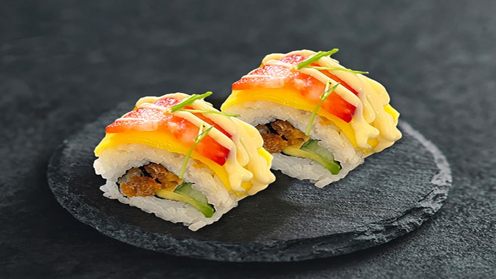 avocado agurk teriyaki sauce tempura kylling ,toppet med ebi rejer avocado teriyaki sauce sesam