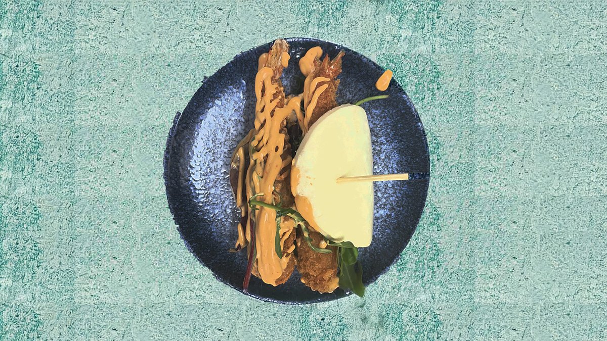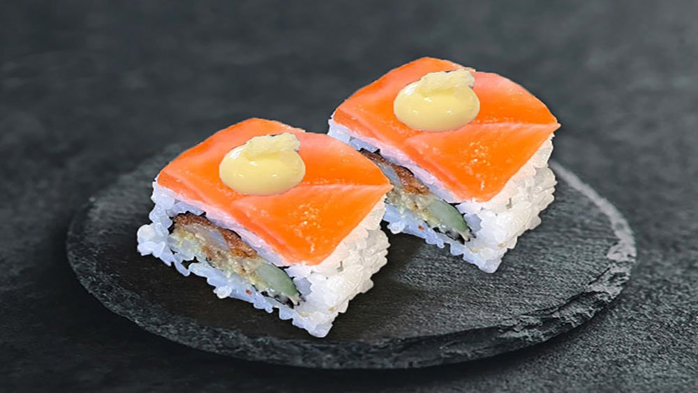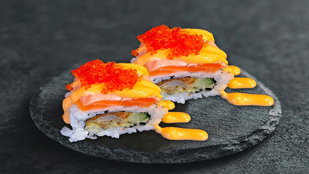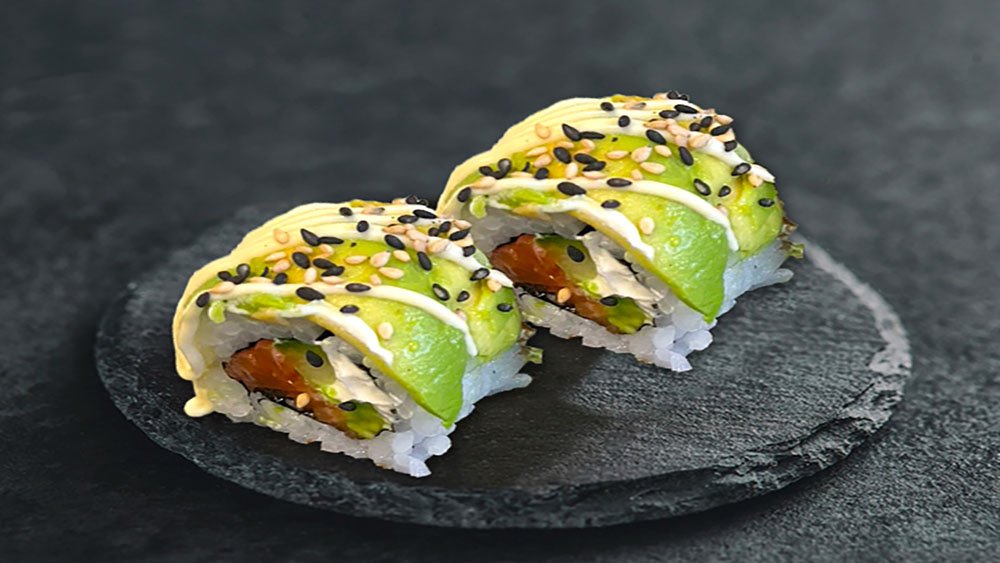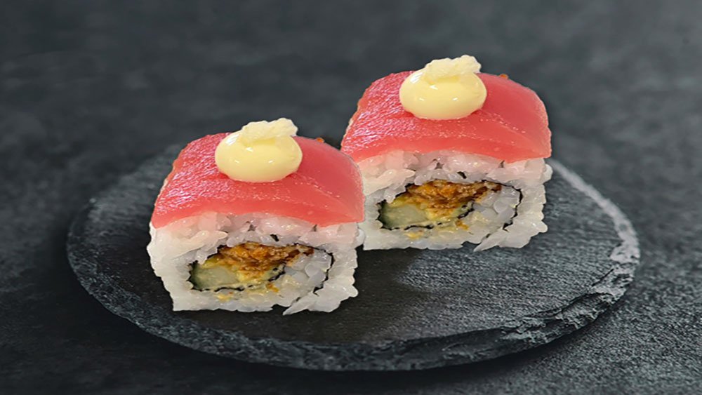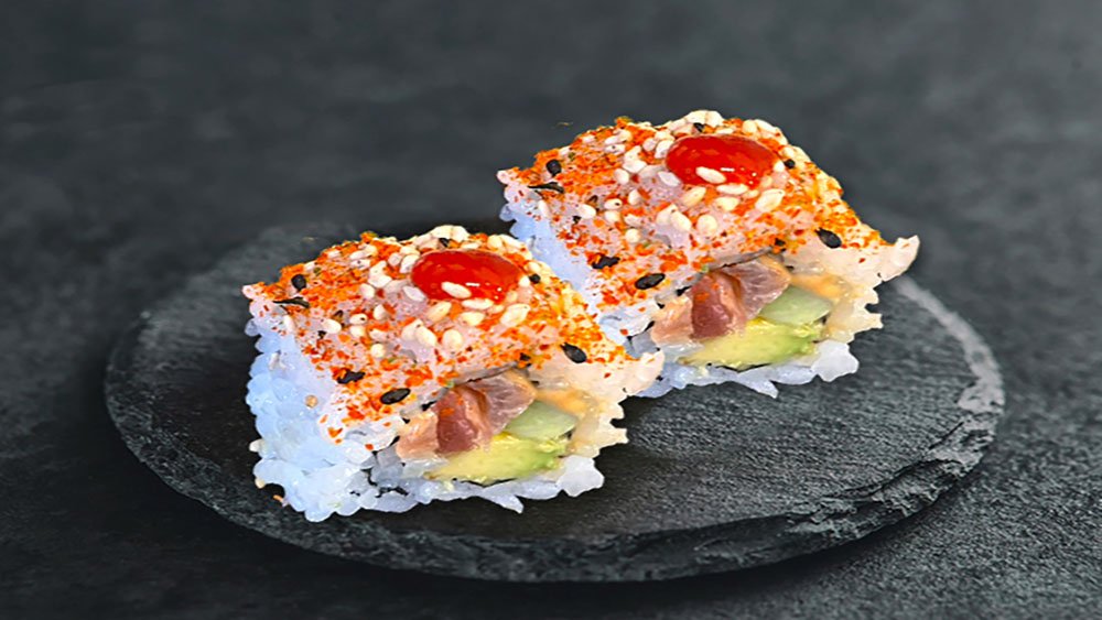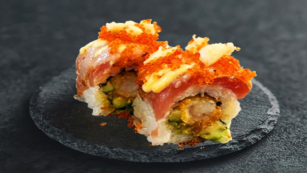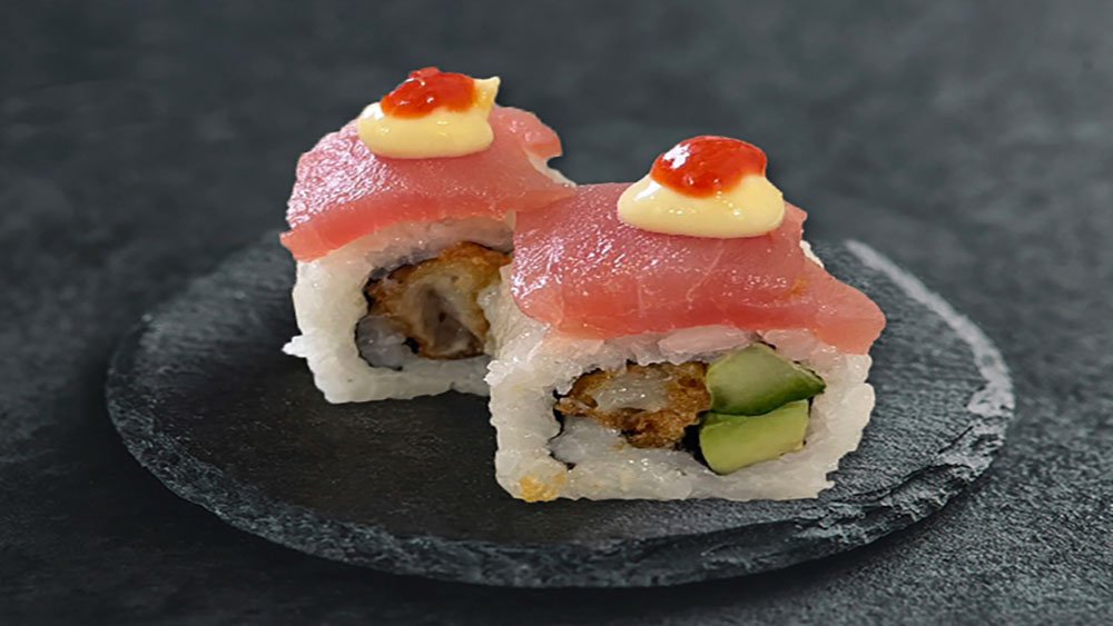 avocado agurk tempura rejer chilimayo,toppet med grillede tun babymayo masago hvidløg