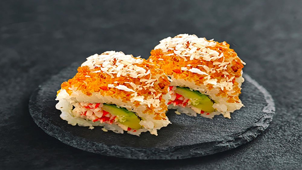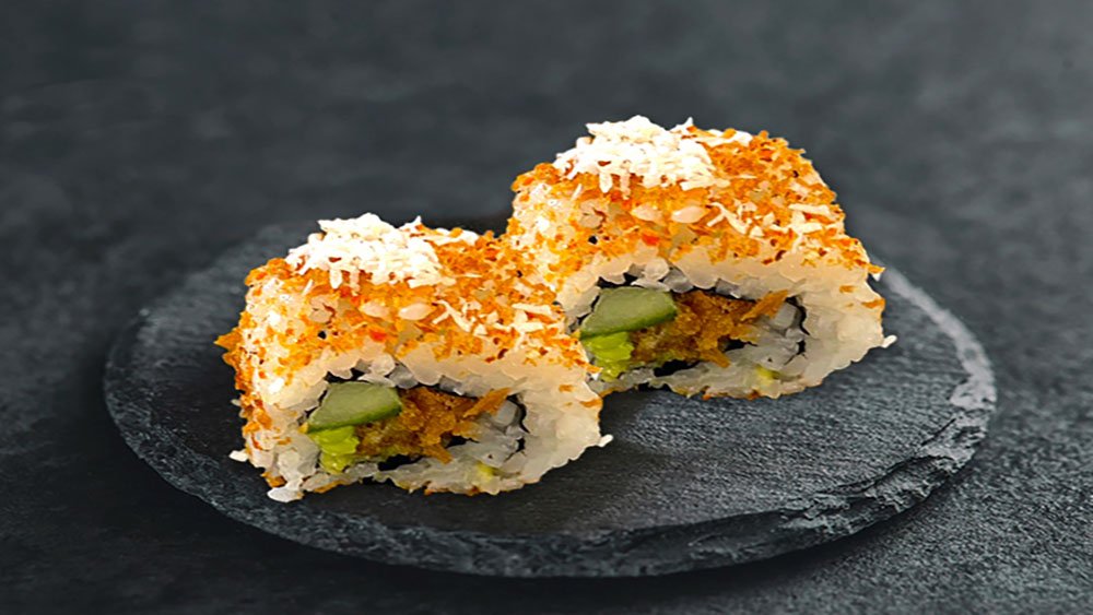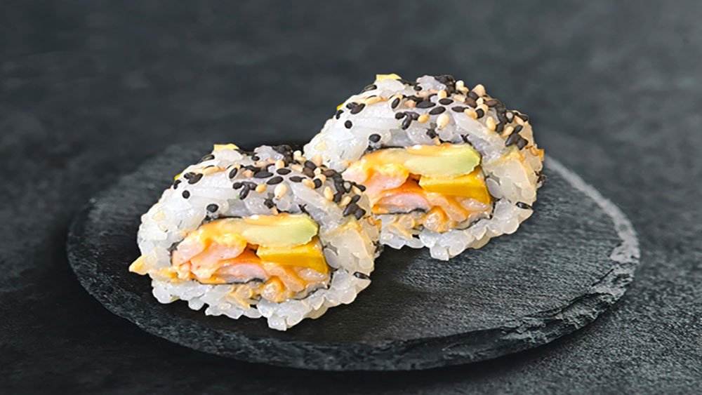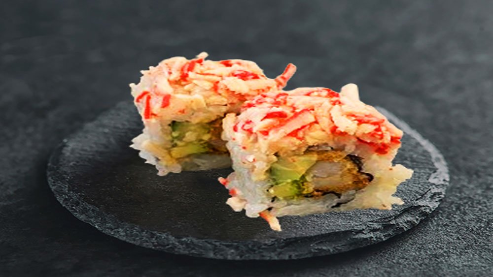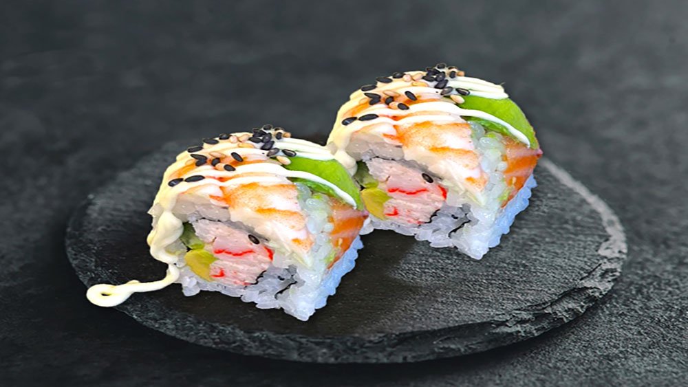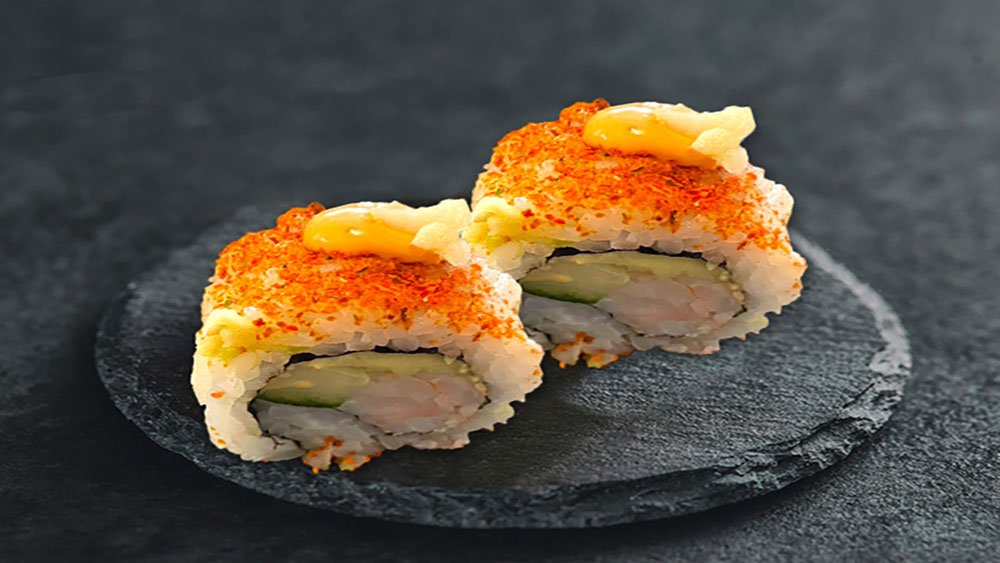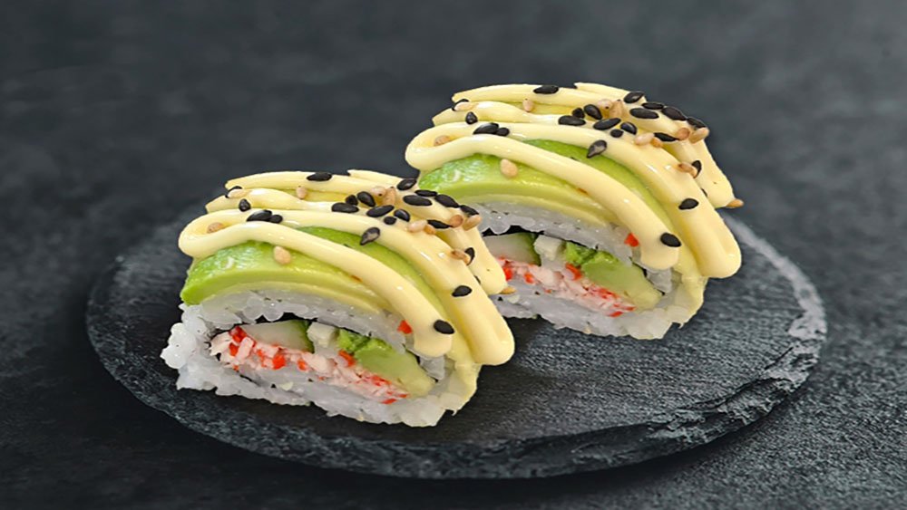 avocado agurk chilimayo tempura rejer ,toppet med surimi